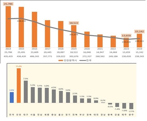 2024년 인천광역시가 저출산 문제 극복에 있어 전국에서 가장 두드러진 성과를 보이며 새로운 해법을 제시하고 있다. 통계청 발표에 따르면 인천의 2024년 출생아 수는 전년 대비 11.6% 증가(15,242명)하며 전국 출생아 증가율 1위를 기록했다. 이는 전국 평균 출생아 증가율(3.6%)의 세 배를 웃도는 수준이다. 인천형 저출산 정책, 인구 유입 증가, 맞춤형 지원책 등이 이러한 성과의 배경으로 꼽히고 이는 인천이 대한민국의 인구문제 해결에 있어 중요한 모델로 자리 잡고 있다는 점을 시사한다.