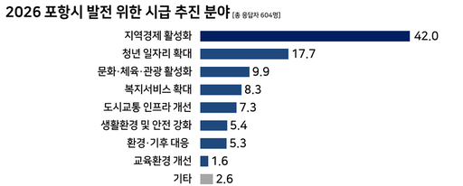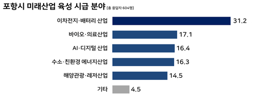 교육 분야에서는 '포스텍 의대 설립 등 고등교육 육성'이 38.5%로 가장 높았다. 단순 대학 설립을 넘어 지역 의료 인프라 확충, 고급 인재 유입, 정주 여건 개선 등 복합적 효과에 대한 시민 인식이 반영된 결과로 해석된다.