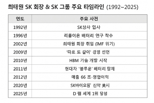 최태원 회장은 IMF 위기의 한복판에서 출발해 30년여 동안 SK그룹을 글로벌 기업으로 성장시켰다. 반도체·배터리·바이오라는 3대 축은 그가 취임 초 던진 "Deep Change"라는 메시지가 빈말이 아니었음을 증명한다. 내수 중심이던 SK는 이제 세계 무대에서 한국 경제를 대표하는 수출 명가로 자리 잡았다.