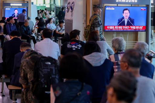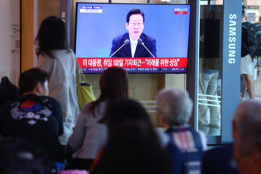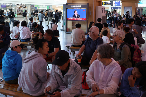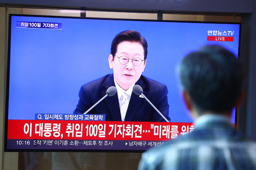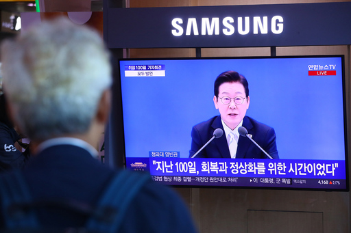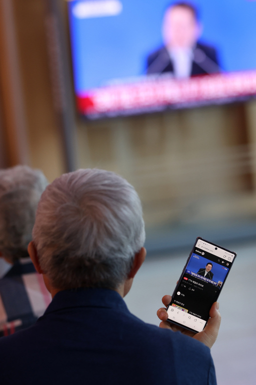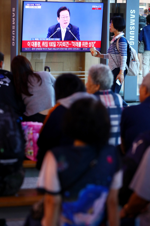 이재명 대통령의 취임 100일 기자회견이 진행된 11일 서울역 대합실을 찾은 시민들이 중계되는 기자회견을 지켜보고 있다.