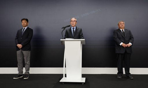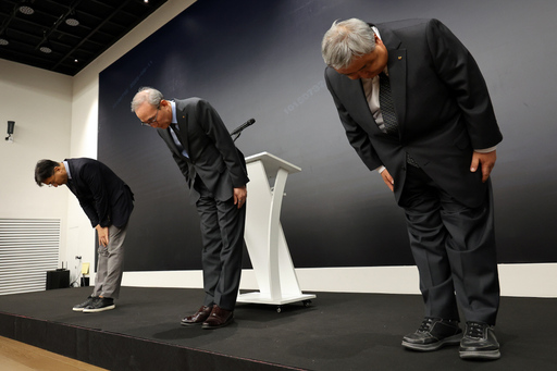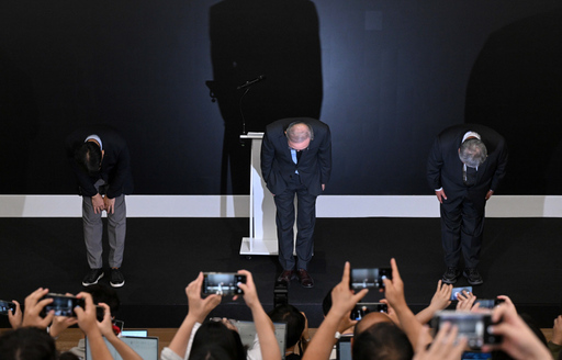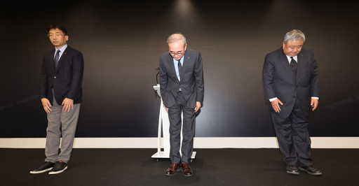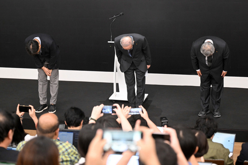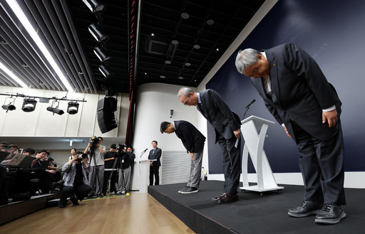KT 김영섭 사장을 비롯한 임직원들이 11일 서울 종로구 KT 광화문빌딩 웨스트 사옥에서 최근 발생한 소액결제 피해와 관련해 고개 숙여 사과하고 있다. 왼쪽부터 서창석 KT 네트워크 부문장 부사장, 김 사장, 이현석 커스터머 부문장 부사장. / 손진영기자 son@