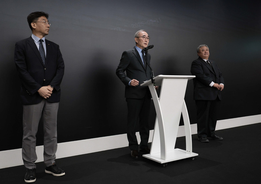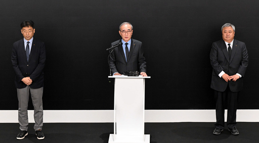 김영섭 KT 대표이사가 11일 오후 서울 종로구 KT 광화문 West 사옥에서 소액결제 피해 관련 기자 브리핑을 하고 있다.왼쪽부터 서창석 KT 네트워크부문장, 김 대표이사, 이현석 KT 고객(Customer)부문장. / 손진영기자 son@