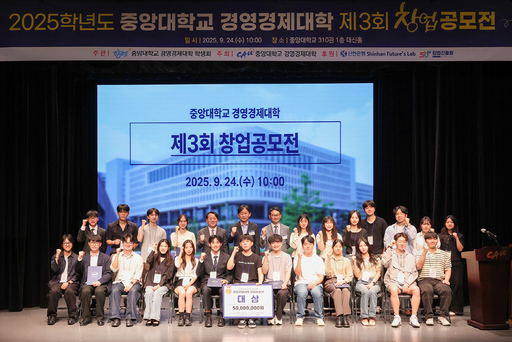 중앙대학교(총장 박상규)는 24일 경영경제대학(학장 김창봉) 주관으로 310관(100주년 기념관) 대신홀에서 '2025학년도 제3회 경영경제대학 창업공모전'을 개최했다고 30일 밝혔다. 재학생들의 창업 경험과 사업화 지원을 위한 행사로, 신한은행과 창업진흥원이 후원했으며 대상 팀에는 상금 5000만원이 수여됐다.