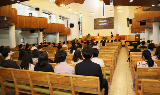 말씀을 전한 전철 교목실장은 '새로운 피조물'을 주제로 시간의 의미를 강조하며 "일상의 시간 속에서도 변화의 순간을 준비하자"고 했다.
