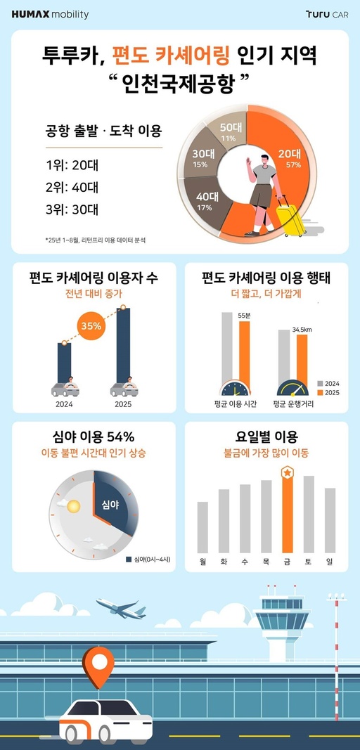 휴맥스모빌리티의 카셰어링 브랜드 투루카는 편도형 카셰어링 서비스 리턴프리의 올해 1~8월 이용 현황을 분석한 결과 인천국제공항과 인접한 거점이 인기 출발지와 도착지로 나타났다고 1일 밝혔다.