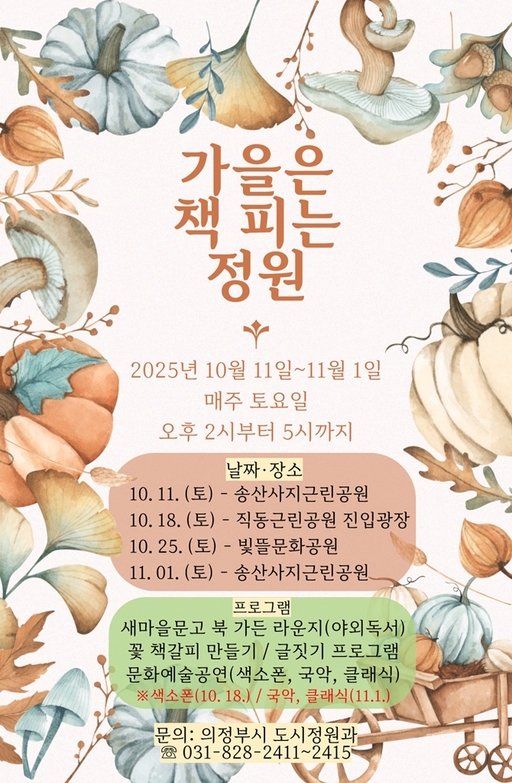 시는 10월 11일부터 11월 1일 매주 토요일 오후 2시부터 5시까지 4회에 걸쳐 송산사지 근린공원, 직동 진입광장, 빛뜰문화공원에서 '가을은 책피는 정원' 행사를 순회 개최한다.