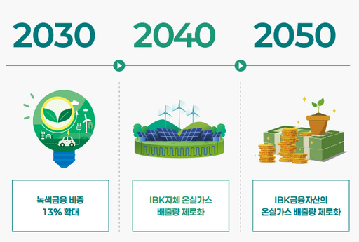 2030년까지는 녹색금융비중을 13%로 확대한 뒤, 2040년 IBK자체 온실가스 배출량을 제로화 한다. 2050년에는 IBK금융자사의 온실가스 배출량을 제로로 만들 계획이다.
