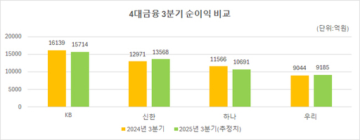 12일 금융정보업체 에프앤가이드에 따르면 4대 금융지주의 3분기 지배주주 귀속순이익은 4조9158억원으로 추정됐다. 전 분기(4조9720억원)와 비교해 1.13% 감소한 수준이다.