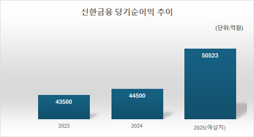 진 회장 취임 이후 신한금융의 순이익은 2023년 4조3680억원에서 2024년 4조4500억원으로 증가했다. 금융정보업체 에프앤가이드는 신한금융의 올해 순이익을 5조523억원으로 예상했다. 전년 대비 13.58% 증가하는 수준이다.