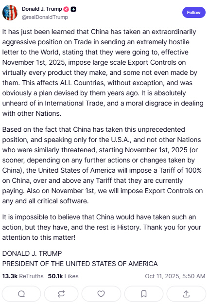 트럼프는 지난 10일(현지시간) 자신의 사회관계망서비스(SNS)를 통해 중국의 희토류 통제 조치를 겨냥해 "11월부터 중국에 현재 부과하고 있는 관세에 더해 100%의 추가 관세를 부과하고, 모든 핵심 소프트웨어에 대해 수출 통제를 시행할 것"이라며 반격에 나섰다.