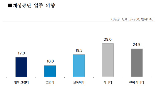 남북경제협력이 '한국 경제 발전에 도움이 되느냐'는 질문에는 입주기업의 90.9%, 비입주기업의 28.3%가 '그렇다'고 각각 답했다. 입주사 가운데 '도움이 되지 않는다'고 답변한 기업은 단 한 곳도 없었다. 비입주기업 중에선 '보통'이라는 평가가 44.5%로 가장 많았다. '아니다'(26.9%)는 '그렇다'보다 다소 적었다.