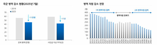 한국군 병력은 지난 2019년 56만명에서 올해 45만명 수준으로 줄었다. 향후 10년간 병역자원 절벽이 이어질 것으로 전밍되면서 군 전력 유지의 공백은 불가피하다.