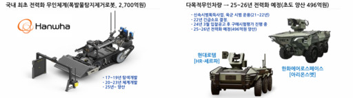 한국 역시 같은 방향으로 움직이고 있다. 병역자원 감소와 국방 예산 효율화 필요성이 맞물리면서 육·해·공 각 군이 무인 자산 확보에 속도를 내고 있다. 한화에어로스페이스는 폭발물탐지제거로봇으로 국내 최초 무인체계 전력화를 달성했고, 현대로템은 다목적 무인차량 '셰르파', LIG넥스원은 정찰용 무인수상정 체계개발에 나섰다. 공군은 KF-21 전투기를 기반으로 유무인 복합체계(AAP, UCAV) 실증을 추진하며 '한국형 CCA'의 기초를 다지고 있다.