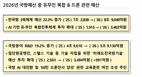 이어 "AI와 자율화가 무기의 눈과 귀를 대신하면서 전장은 더 넓고 빠르게 확장되고 있다"며 "무인의 시대는 기술의 진보가 아니라 생존의 논리로 국가 간 전력 격차를 재편하는 결정적 요인이 되고 있다"고 덧붙였다.