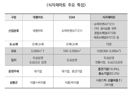 현재 유통산업발전법은 대기업이 운영하고 있는 3000㎡ 이상의 대형마트, 대기업과 중견기업이 주인인 165~3000㎡ 규모의 SSM을 규제 대상으로 하고 있다. 관련법 개정안은 900~3000㎡ 미만 식자재마트도 준대규모점포에 포함해 대형마트, SSM과 같이 의무휴업 등의 규제를 해야한다는 내용을 담고 있다.