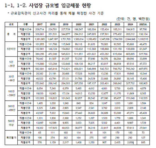 30인 미만 소규모 사업장에 대한 임금체불 인원 비율을 연도별로 보면 2022년 81.1%, 2023년 83.6%, 2024년 80.5% 로 3년 평균 10명 중 8명의 영세 소규모 사업장의 근로자들이 임금체불의 고통을 겪은 것으로 나타났다. 정 의원실은 경기 침체의 충격이 서민경제와 소상공인에게 직접적으로 영향을 준 것이라고 해석했다.