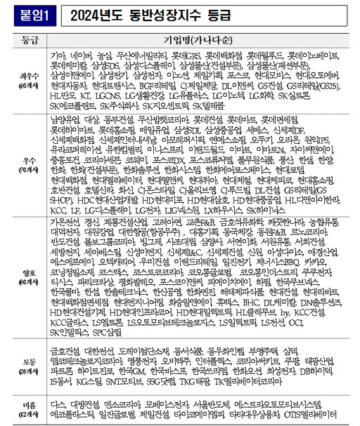 동반성장지수는 동반위의 '동반성장 종합평가'와 공정거래위원회의 '공정거래협약이행평가' 결과를 합산해 최우수-우수-양호-보통-미흡의 5개 등급으로 평가한다.
