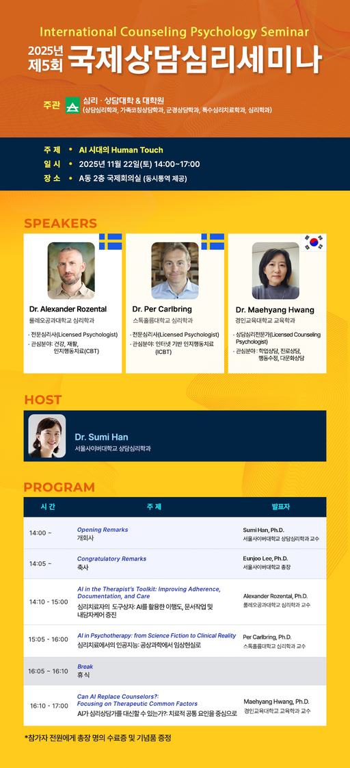 세미나는 'AI 시대의 Human Touch'라는 주제로 강사 3인의 현장 강의가 동시통역 제공과 함께 진행한다. ▲ Alexander Rozental 박사 (스웨덴 룰레오공과대학교 심리학과 교수) ? 심리치료자의 도구상자: AI를 활용한 이행도, 문서작업 및 내담자케어 증진 ▲ Per Carlbring 박사 (스웨덴 스톡홀름대학교 심리학과 교수) ? 심리치료에서의 인공지능: 공상과학에서 임상현실로 ▲ 황매향 박사 (경인교육대학교 교육학과 교수) ? AI가 심리상담가를 대신할 수 있는가?: 치료적 공통 요인을 중심으로 라는 3개의 발표가 진행될 예정이다.