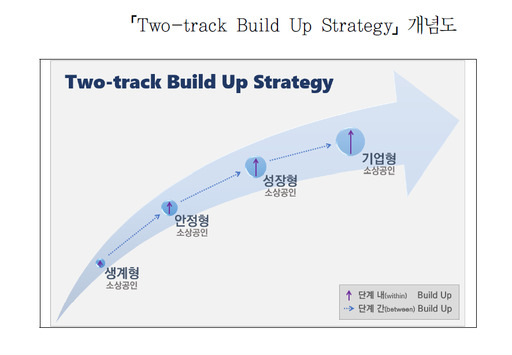 토론회에서 소상공인연합회는 소상공인의 성장을 위해 "단계 내(within)-단계 간(between) 이원화된 성장 전략 추진이 필요하다"며 'Two-track Build Up Strategy'를 정책으로 제언했다.