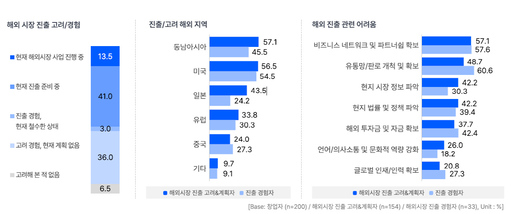 스타트업의 41%는 해외 진출을 준비하고 있다. 13.5%는 실제로 해외시장 사업을 진행하고 있다. 절반이 넘는 54.5%가 실제 진출하고 있거나 계획하고 있는 모습이다. 진출을 원하는 지역은 동남아시아(57.1%), 미국(56.5%), 일본(43.5%) 순이었다.