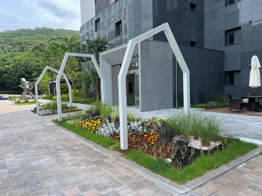 단지 내로 올라가면 필로티와 연계한 테마 정원과 수경시설이 나온다. 공원 속 식물원 처럼 출입구 쪽으로는 대형목으로 식재를 하고, 안쪽으로는 사계절 경관을 즐길 수 있는 초화류를 배치했다. 어린이들이 뛰어놀 수 있는 놀이터 역시 자연을 모티브로 했다. 숲속 놀이터는 거대한 소나무를 모던 디자인 형태로 풀어냈고, 도란도란 놀이터는 꽃이 가득 핀 숲 속 정원의 새장으로 표현했다.