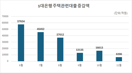 6월 5조7634억원 증가한 주택관련 대출은 7월 4조5452억원으로 줄었다. 10월 1조6612억원 증가했던 주택관련대출은 11월 6396억원으로 감소했다. 정부가 6·27대책으로 수도권 지역의 금융유동성을 차단한데 이어 10·15대책에서 수도권 지역을 3중 규제지역으로 묶은 영향이다.
