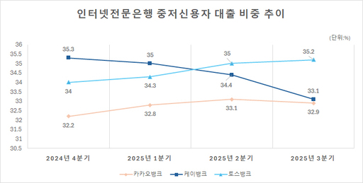 카카오뱅크는 중·저신용 대출을 최저 3% 금리에 공급하며, 중저신용 대출 비중을 늘렸다. 중·저신용자 대출 비중은 지난해 말 32.2%에서 ▲올해 1분기 32.8% ▲2분기 33.1%까지 오른 뒤 ▲3분기 32.9%로 소폭 하락했다.