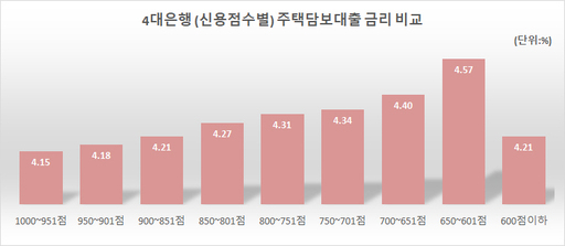 4대 은행의 주담대 중 신용 점수 600점 이하의 금리는 평균 4.21%이지만 850~801점인 금리는 평균 4.27%로 고신용자보다 저신용자의 금리가 0.06%p 낮았다. 신한은행의 600점 이하 금리는 3.67%인 반면 951~1000점 금리는 4.14%로 고신용자보다 저신용자의 금리가 0.47%p 낮았다.