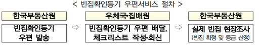 빈집실태조사를 대행하는 부동산원이 추정 빈집에 대해 빈집확인 등기를 발송하면 지역 사정을 잘 아는 우체국 집배원이 해당 주택을 방문해 주택 외관, 거주자 유무 등 빈집 확인 체크리스트를 작성해 부동산원에 회신하는 방식으로 진행된다.