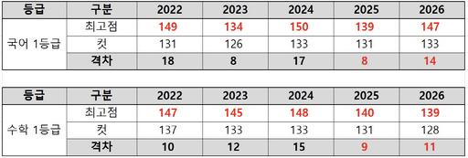 국어와 수학의 1등급 구간 내 점수 차도 동반 확대됐다. 국어는 14점(전년 8점), 수학은 11점(전년 9점) 차이가 발생해 두 과목 모두 변별력이 강화됐다.
