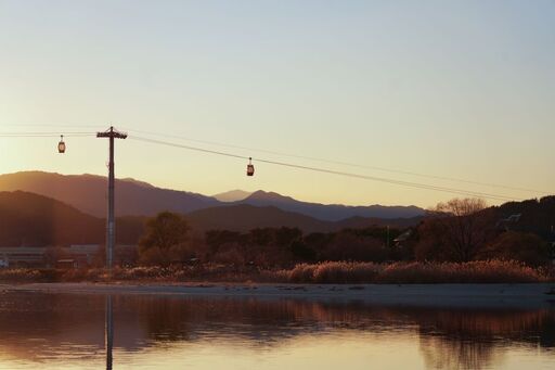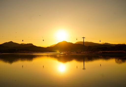 낮의 잔광이 강을 감싸며 금빛으로 번지는 순간, 하늘과 물, 산과 케이블카가 하나의 그림처럼 어우러진다. 강 건너편 능선은 은은한 보랏빛을 띠고, 바람결을 따라 흔들리는 억새가 그 위에 부드러운 결을 더한다.