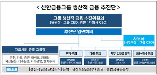 신한금융은 지난 11월 해당 조직을 최고경영자(CEO)를 위원장으로 하는 '그룹 생산적 금융 추진위원회로 격상해 기본 구상을 마련했다. 이번에는 해당 전략을 현장에서 속도감 있게 실행하고 효과성을 높이기 위해 '그룹 생산적 금융 추진단'을 발족시켰다.