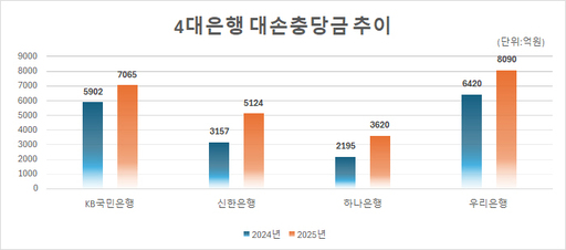 우리은행과 KB국민은행 역시 충당금 적립 규모를 확대했다. 우리은행은 8090억원으로 전년 동기(6420억원) 대비 26.0% 늘었고, 국민은행은 7065억원으로 5902억원보다 19.7% 상승했다.