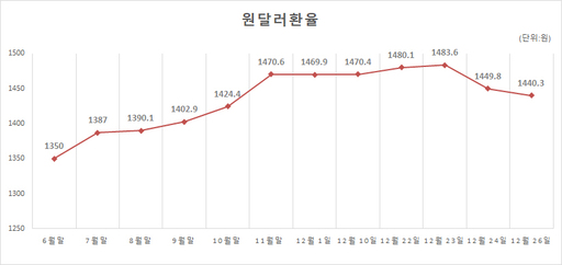 한국은행 경제통계시스템에 따르면 지난달 평균 달러당 1457.77원을 기록했다. 원·달러 환율은 ▲9월 1391.83원 ▲10월 1423.36원 ▲11월 1457.77원으로 상승했다. 정부의 개입으로 이날 환율은 1440원을 밑돌고 있지만, 12월 초만해도 평균이 1470원대를 넘었다.