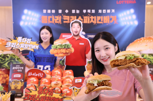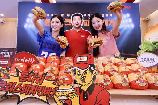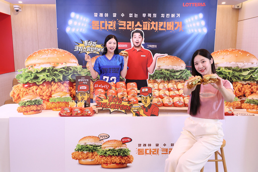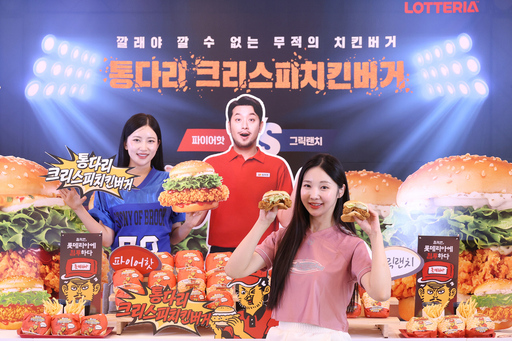 롯데리아가 6일 서울 용산구 롯데리아 숙대입구역점에서 신메뉴 '통다리살 크리스피치킨버거' 2종을 선보이고 있다.