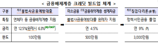 정부가 정책서민금융상품인 '햇살론15'와 최저 신용자 특례 보증을 '햇살론 특례 보증'으로 합치고, 금리는 연 15.9%에서 연 12.5%로 낮춘다. 불법사금융 예방 대출을 받은 차주는 완제 시 미소금융을, 이후 은행권 징검다리론을 이용할 수 있게 해 은행권 대출이나 금융서비스 이용 기회를 확대할 계획이다.