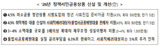 금융위는 고졸자 미취업자 등 청년을 대상으로 '미소금융 청년 상품'을 도입한다. 대상은 사회 진입을 위한 자금(학원비, 창업 준비금 등)이 필요한 청년으로, 연 4.5% 최대 500만 원(만기 5년)을 지원한다.