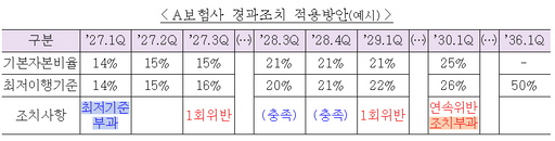 구체적으로는 내년 3월 말을 기준으로 보험사의 기본자본비율이 50%에 미달하는 경우 보험사별로 최저 이행기준을 부과한다. 이행기준을 부과받은 보험사는 경과기간인 9년이 종료되는 2036년까지 분기별로 상향되는 기준을 충족해야 한다. 이를 충족하지는 경우 1년의 이행기간을 부여하며, 이후애도 기준에 미달하는 경우 적기시정조치를 부과받게 된다.