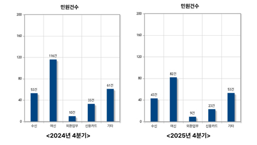 2024년 4분기와 비교하면 여신(116건) -23%, 기타(53건) -13%, 수신(53건) -19%, 신용카드(33건) -30%, 외환업무(10건) -10% 감소한 수준이다.