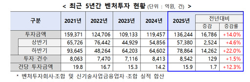 지난해 신규 벤처투자 금액은 2024년(11조9457억원)보다 14.0% 증가한 13조6000억원으로, 2021년(15조9000억원) 이후 역대 두 번째로 높았다. 상반기와 하반기에 각각 5조7000억원, 7조9000억원이 투자됐는데 전년 대비 증가분(1조6786억원)의 약 82%가 하반기에 이뤄졌다. 투자 건수는 8542건으로 최고 기록을 세웠다.