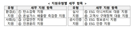 지원 유형은 환경(E), 사회(S), 실사 대응, 공시·인증 지원 등 총 8개 유형으로 구성된다. 환경 분야는 탄소감축 및 온실가스 측정·검증 지원을 포함한다. 사회 분야는 산업안전 및 인권·윤리 체계 구축을 지원한다. 또한 ▲글로벌 ESG 이니셔티브 대응 ▲고객사 공급망 실사 대응 ▲지속가능경영보고서 발간 ▲ISO 인증 취득 지원 등 기업 수요에 기반한 자율형 과제를 폭넓게 지원한다.
