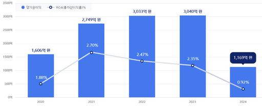 수익성 지표도 자연스레 악화되고 있다. 신한캐피탈의 총자산이익율(ROA)는 지난 2021년 2.70%에서 2022년 2.47%, 2023년 2.35%로 지속적으로 감소하다 2024년 0.92% 수준으로 급격히 떨어졌다.
