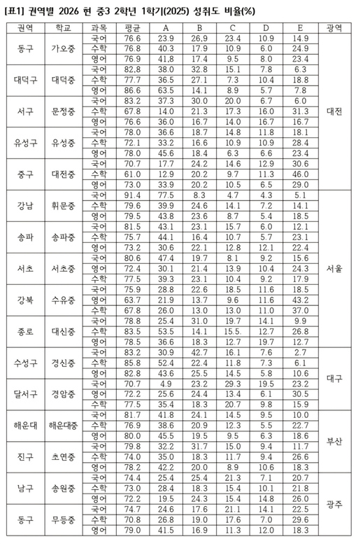 과목별로 살펴보면 변별력의 차이가 더욱 두드러집니다. 대전 문정중(14.0%)이나 대전중(12.9%)처럼 수학 A등급 비율이 현저히 낮은 학교들은 이미 중학교 단계에서부터 고교 수준의 변별력을 확보하고 있으나, 상대적으로 A등급 비율이 높은 영어 등의 과목은 고교 진학 시 성적 급락의 위험이 가장 큰 '착시 구간'이 된다. 따라서 성공적인 대입을 위해서는 지금 당장의 절대평가 점수에 안주하기보다, 수시와 정시를 관통하는 역량의 본질에 집중해야한다.