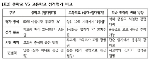 공부 방법의 변화를 논하기에 앞서 두 학령기 사이의 성적 산출 방식을 객관적으로 비교할 필요가 있다. 아래 표는 중학교 A등급이 고등학교에서 어느 정도 위치에 해당하는지를 보여 준다.