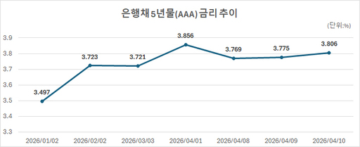 금융투자협회에 따르면 은행채 5년물(AAA) 금리는 1월(3.497%)과 2월 초(3.723%)까지 상승세를 이어가다 3월 3.721%로 떨어진 뒤 4월 3.856%로 반등했다. 지난 10일 기준 3.806%로 다소 낮아졌지만 여전히 높은 수준이다. 이 때문에 대출금리 인하 폭은 제한적인 반면, 예금금리는 이미 낮아진 수준에서 추가 조정이 제한되면서 예대금리차가 다시 벌어지고 있다는 분석이다.