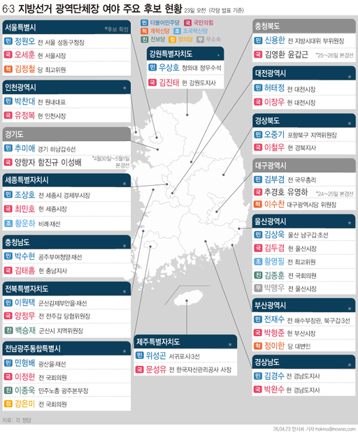 6·3 지방선거가 26일로 한 달여 남은 가운데 더불어민주당이 여론조사 상으로는 경북을 뺀 대부분의 지역에서 우위를 보이고 있다. 사진은 지난 23일 기준으로 광역단체장 선거에 나서는 주요 정당 후보 대진표. /뉴시스
