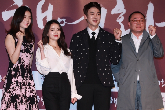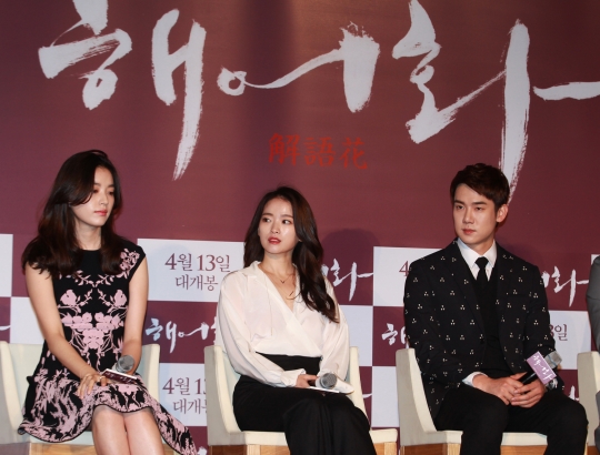 [메트로신문 손진영기자] 14일 오전 서울 광진구 롯데시네마 건대입구점에서 열린 영화 '해어화' 제작보고회에 참석한 출연진들이 포토타임을 갖고 있다.